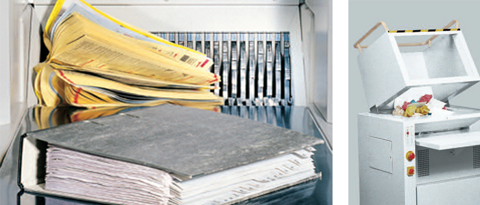 For the robust cutting mechanism of EBA 7050-2 C shredding complete lever arch files including all metal parts is no problem (they are fed to the cutting mechanism via a conveyor belt). Model EBA 7050-3 C: the lever arch files have to be opened before shredding.