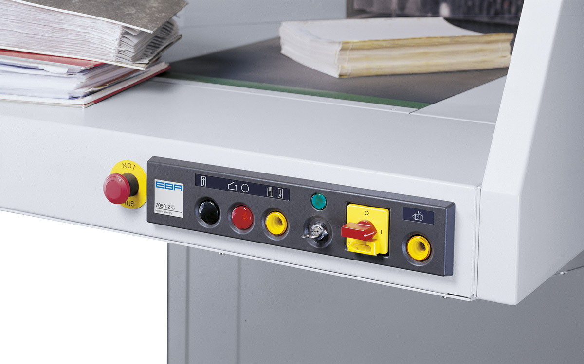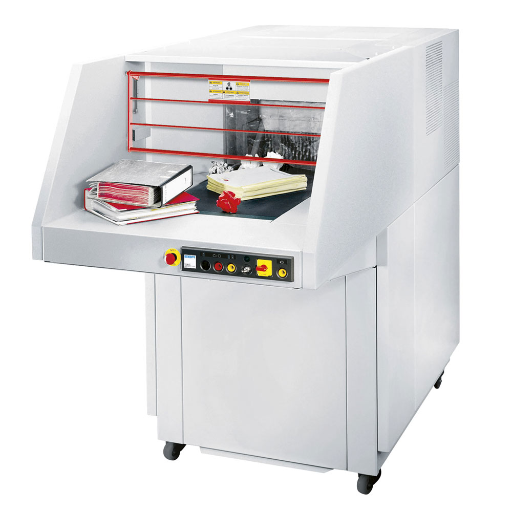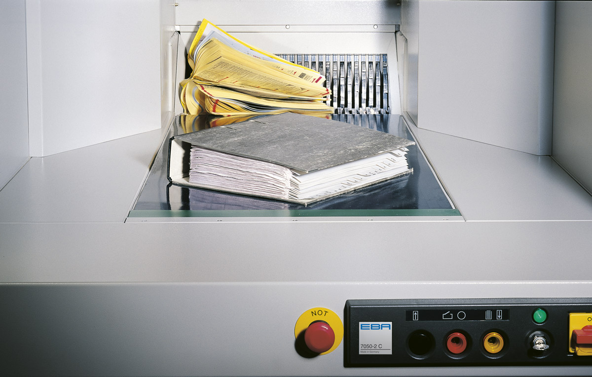For the robust cutting mechanism of EBA 7050-2 C shredding complete lever arch files including all metal parts is no problem (they are fed to the cutting mechanism via a conveyor belt). Model EBA 7050-3 C: the lever arch files have to be opened before shredding.